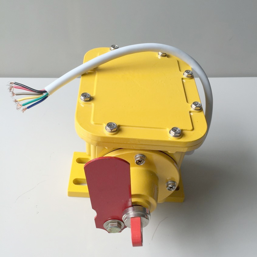 撕裂開關(guān)成對(duì)安裝在兩側(cè),由兩段乙烯外套的航空鋼絲繩連接起來。繩的一端*固定在支撐托架上,另一端連接在撕裂開關(guān)的拉環(huán)上。兩段線繩在皮帶下面形 成一個(gè)閉和的回路,當(dāng)物體或撕裂的皮帶懸吊下來,掃落一條或兩條線繩時(shí) 即探測(cè)出故障。因?yàn)榫€繩受力作用下,它把拉環(huán)軸向外拉出卻使自銷手柄向 上彈起這時(shí)機(jī)內(nèi)兩個(gè)微動(dòng)開關(guān)發(fā)出警示或關(guān)掉輸送機(jī)。故障排除后將自銷手柄往下按使機(jī)內(nèi)的凸輪軸復(fù)位待開機(jī)。